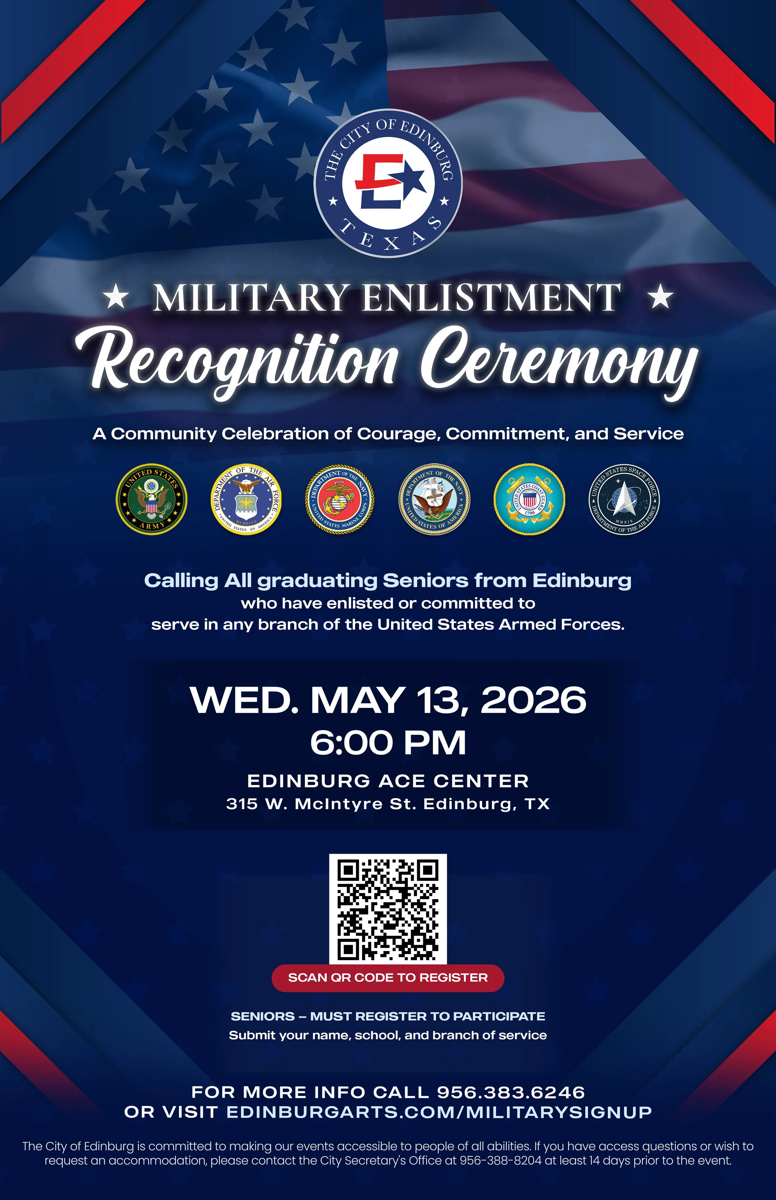 The City of Edinburg Cultural Arts Department, in partnership with the Veterans Committee, invites the community to attend the Military Enlistment Recognition Ceremony on Wednesday, May 13, 2026, at 6:00 p.m. at the Arts, Culture & Events Center, located at 315 W. McIntyre St.
